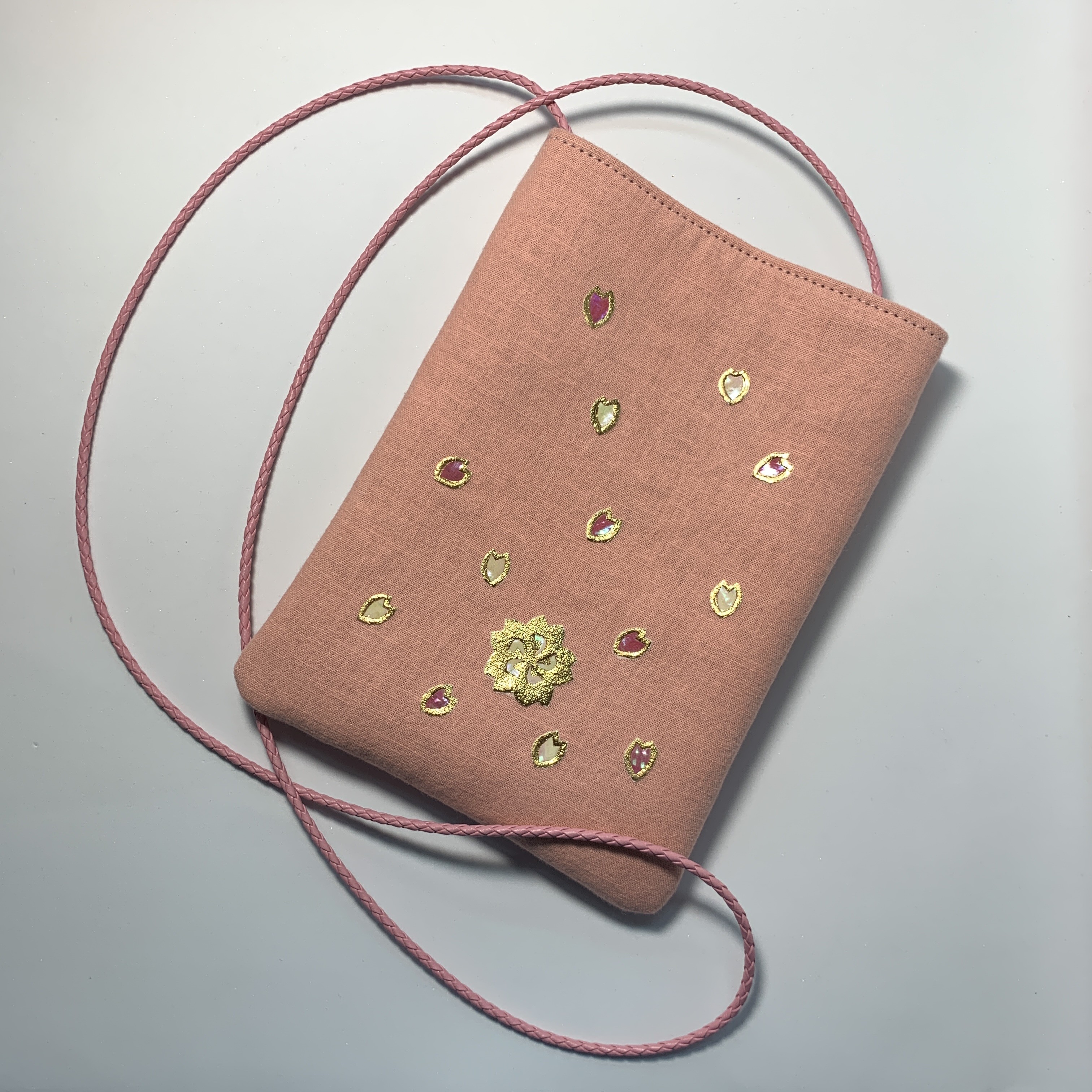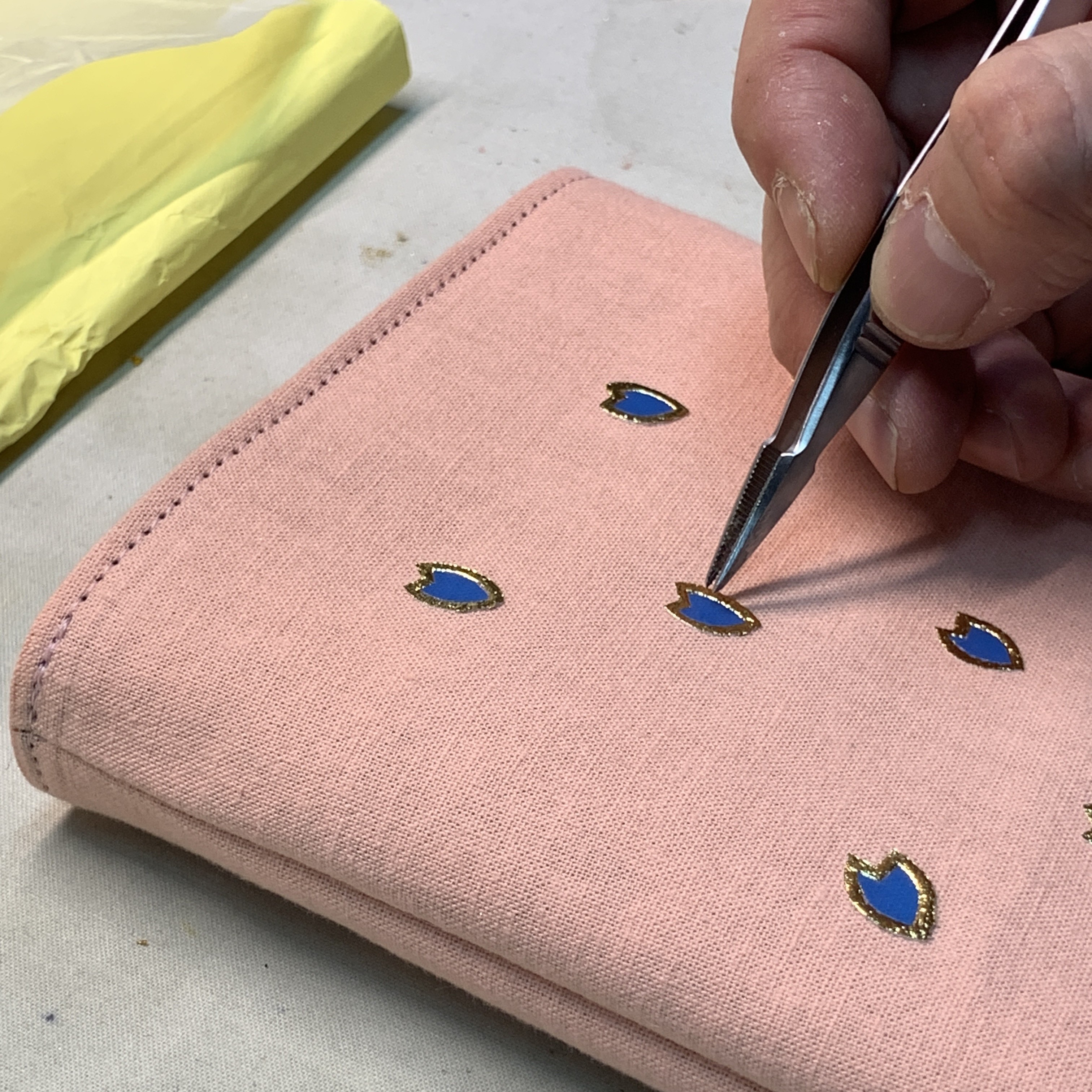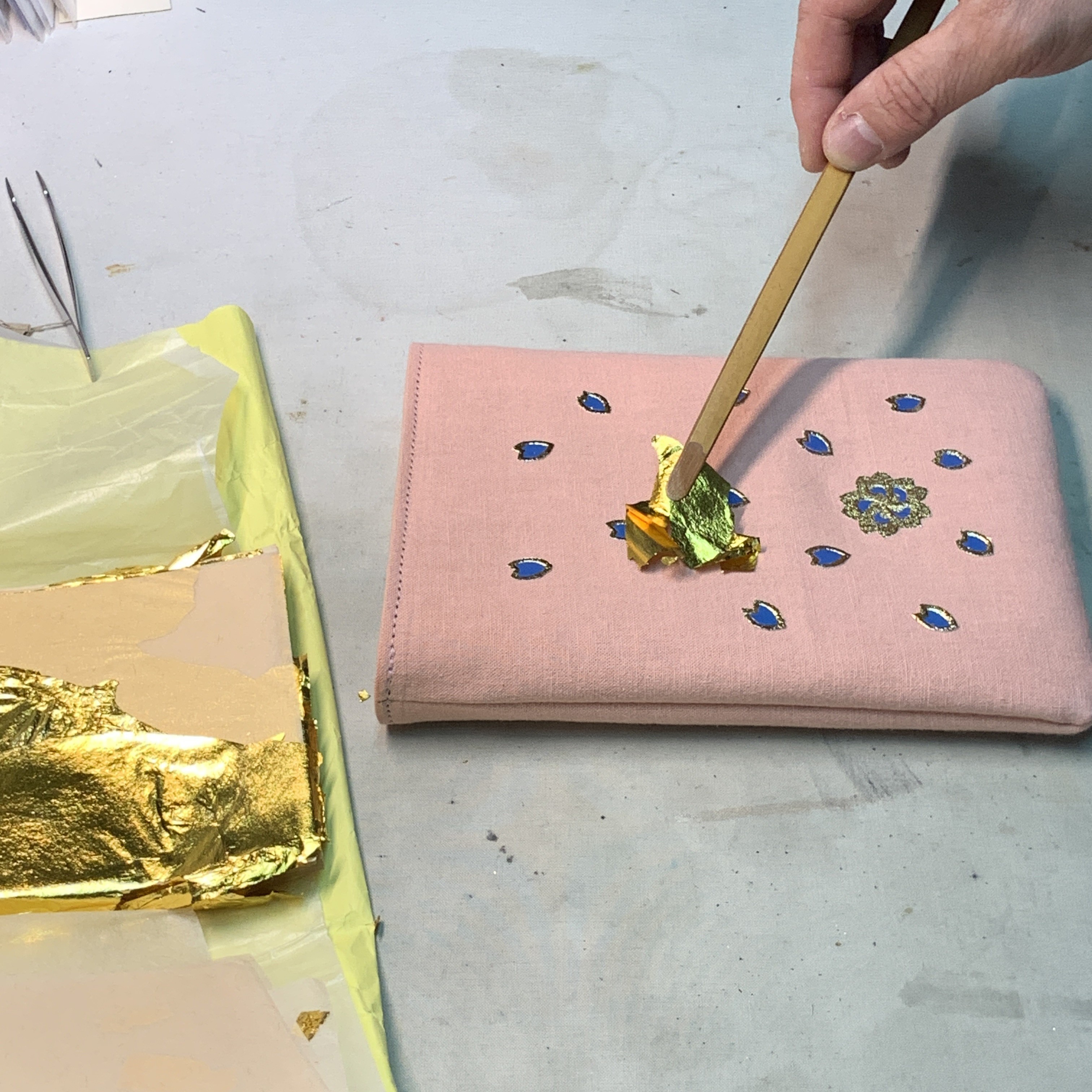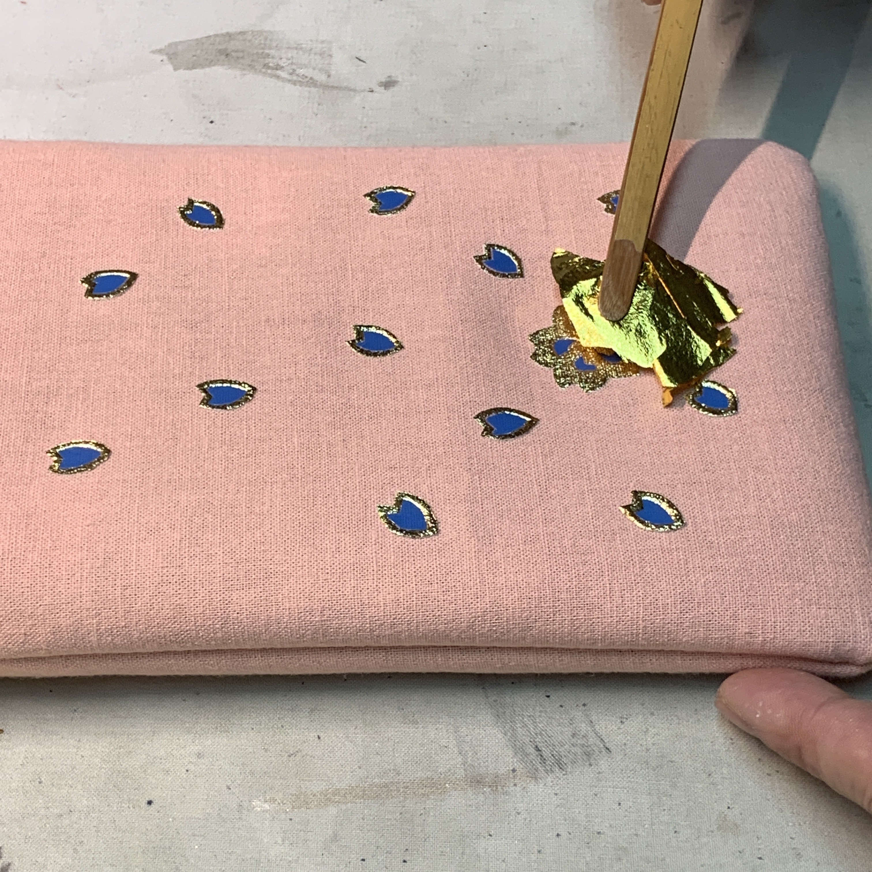 桜染めの生地に、京都の着物の伝統工芸士が、金彩工芸の技法をアレンジして作り上げました。