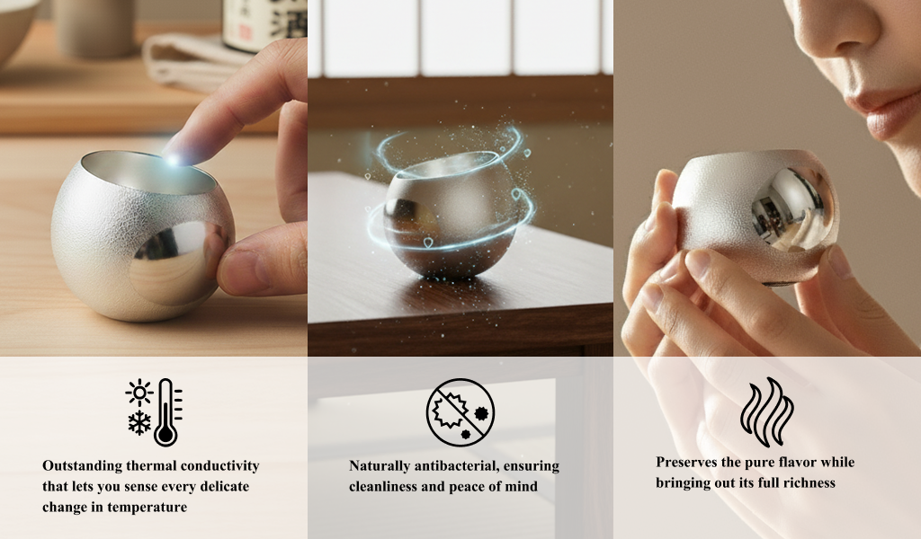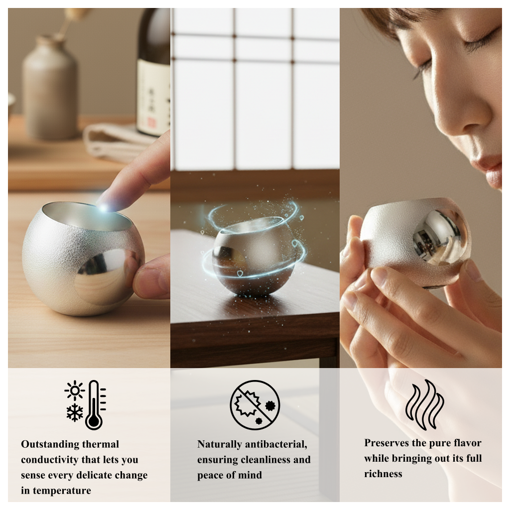 Pure silver never compromises the beverage's flavor and offers excellent antibacterial properties for hygiene. Brings out sake's authentic taste without off-notes.
