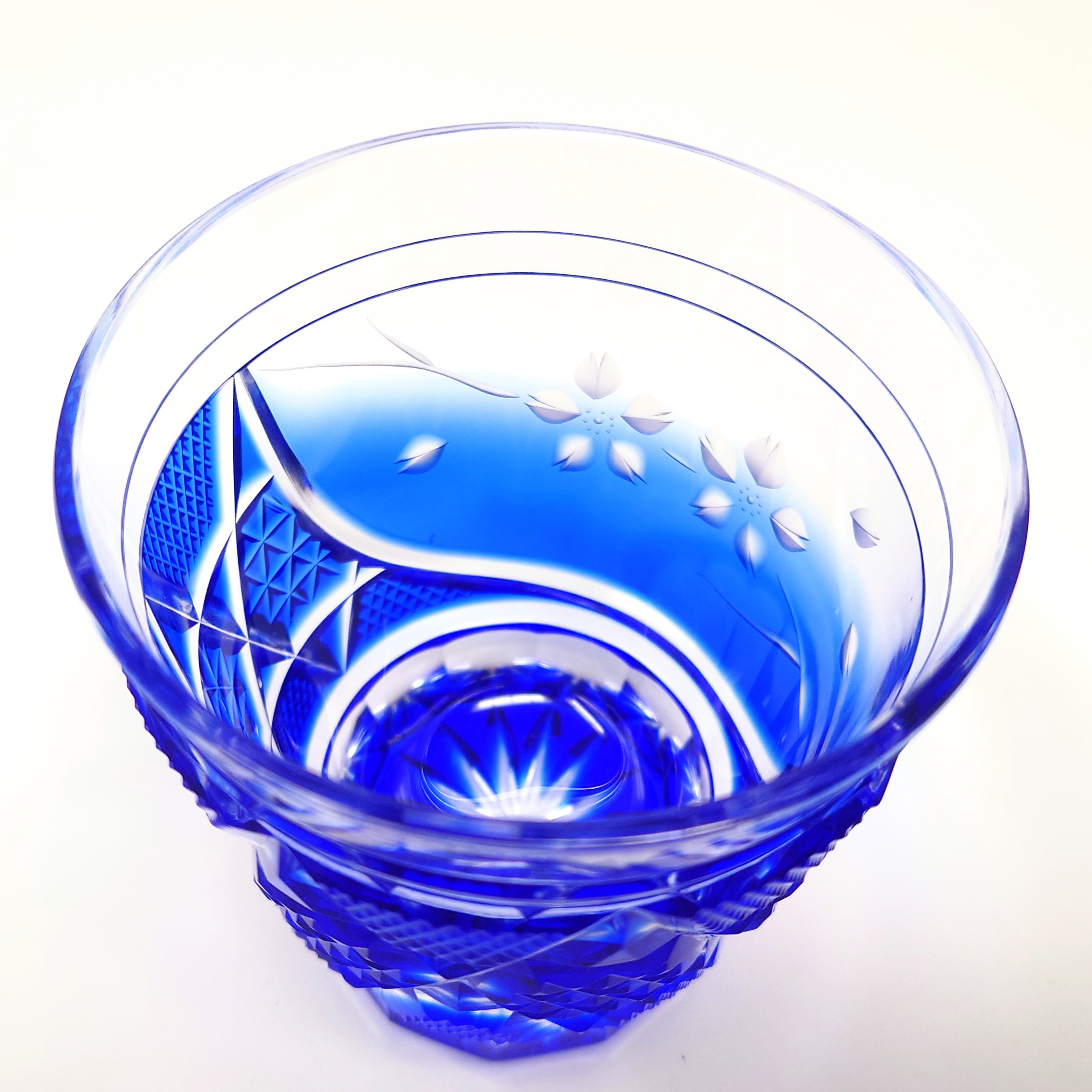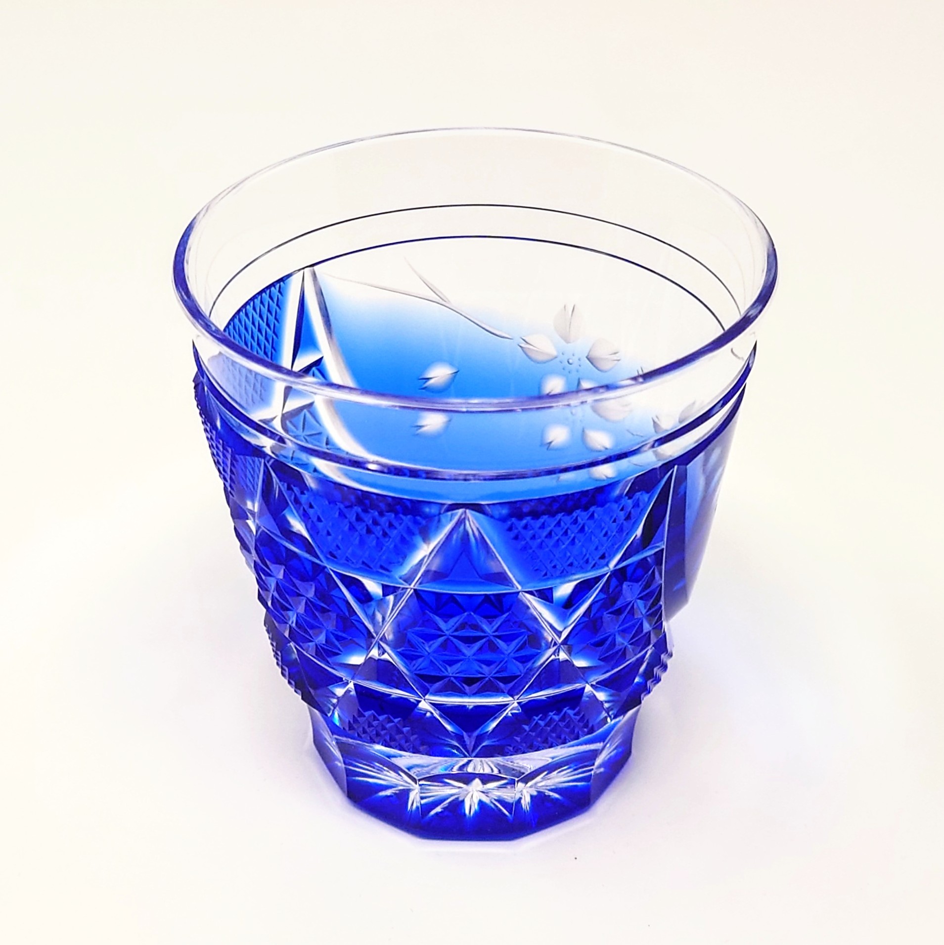 ガラスアーティスト 頌峰(しょうほう)による、この作品 オールドロック(ロックグラス)「花やか」は、桜の花やかなデザインと、天開型の形状で、澄んだ青が特徴。