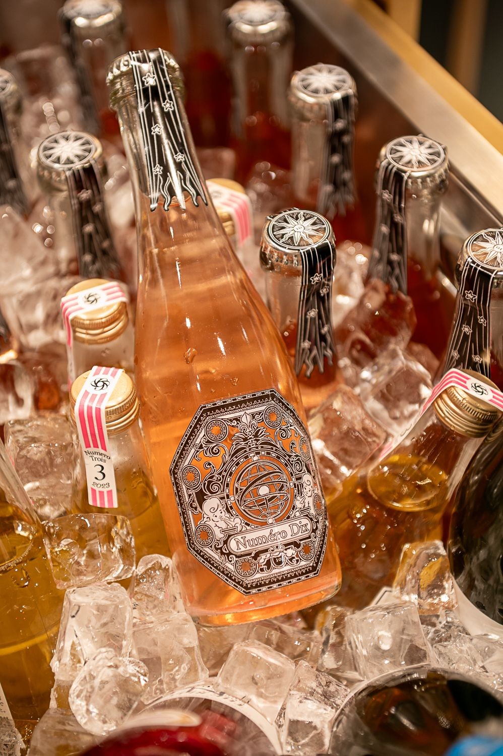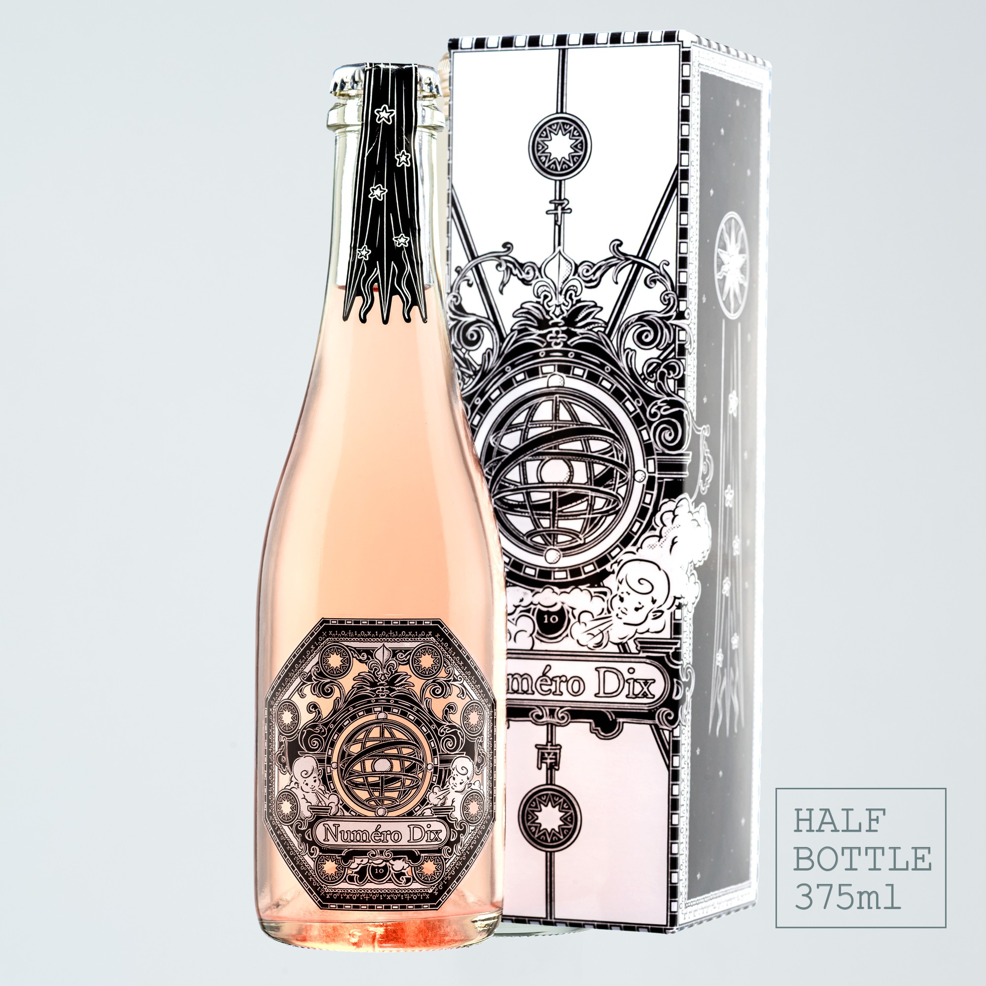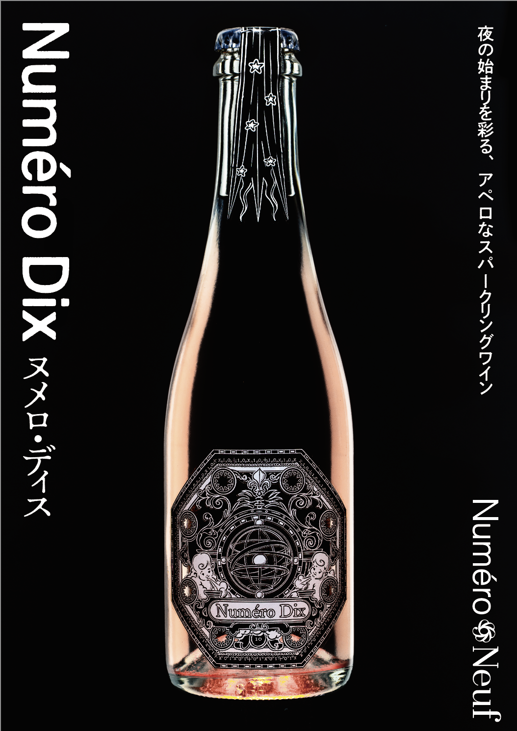 風の表示、フルール・ド・リス、計量規則、世界中に吹く風を表現したプッティ、流れ星、日本とヨーロッパの数字の10の表記など、一連の視覚的なディテールが全体を豊かにしている。このワインの微妙なピンク色を際立たせるために透明感を大切にした。
