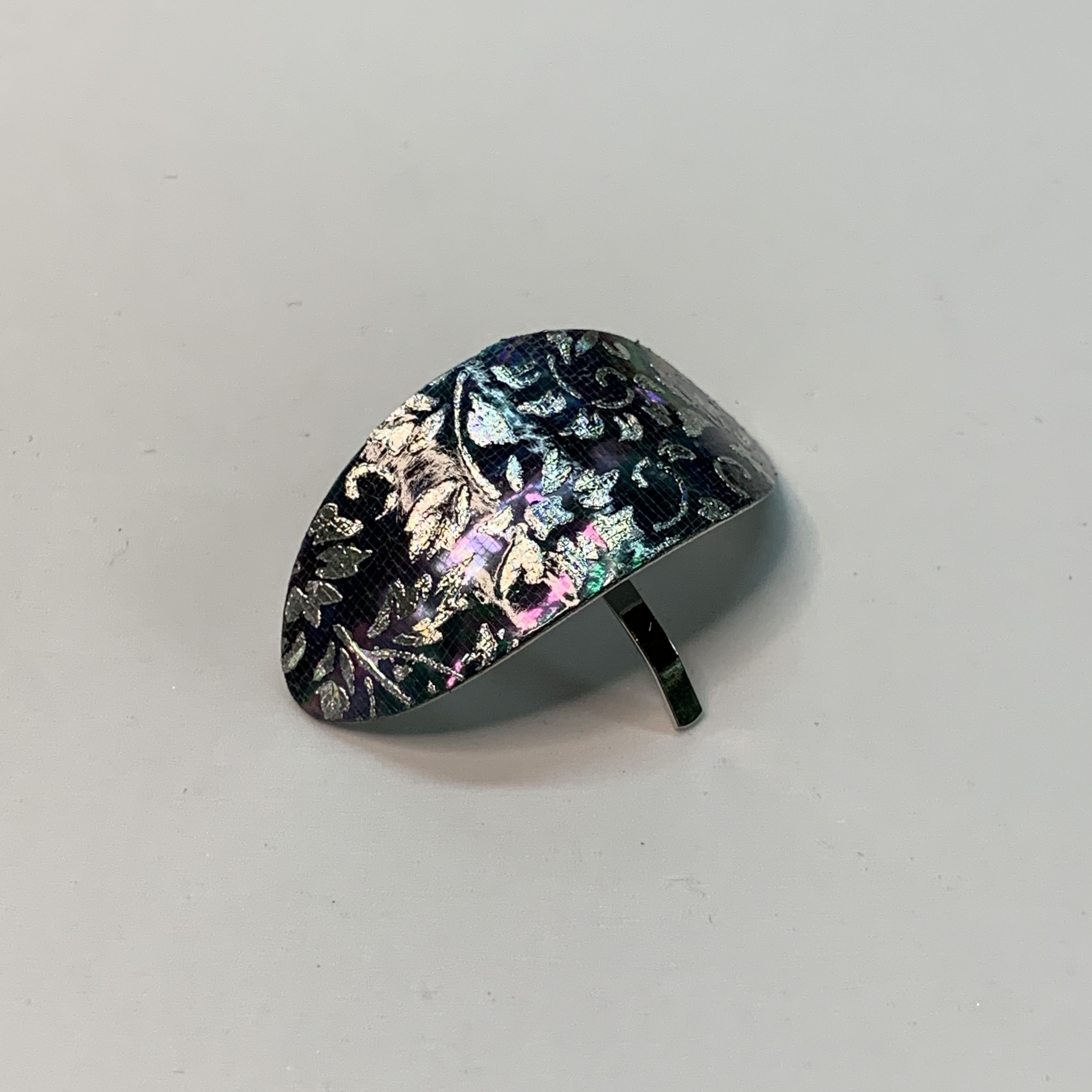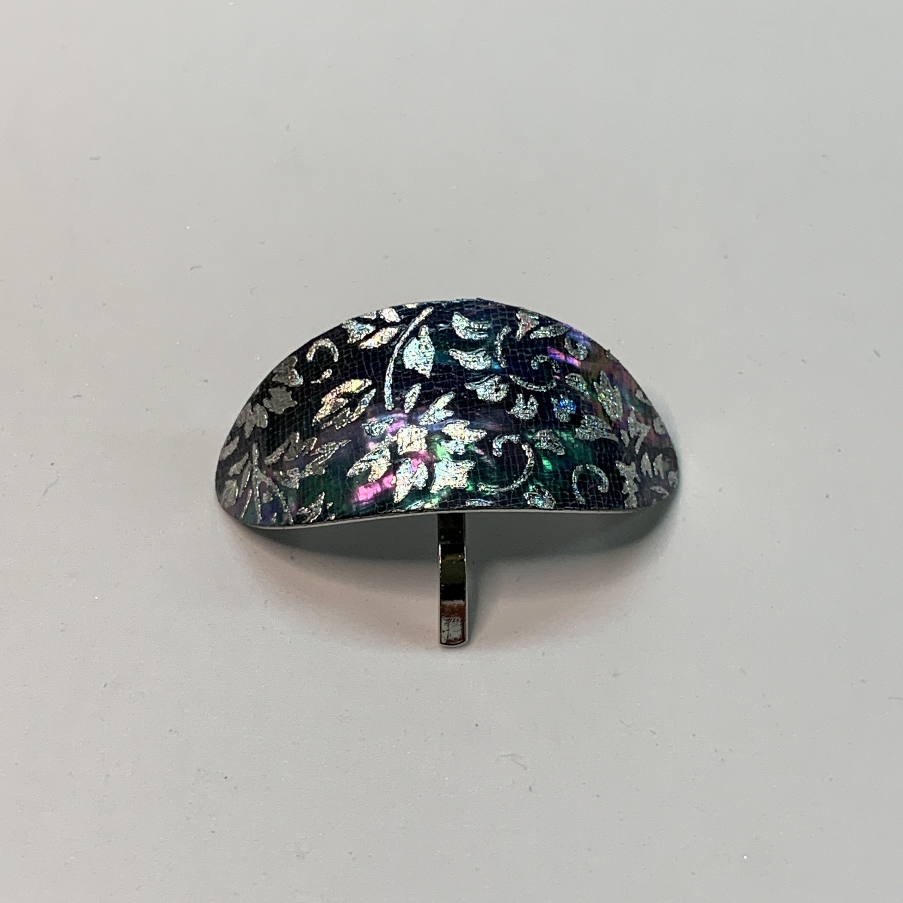 天然素材のアワビの貝殻の内側のエナメル質の部分を削り出した後、独自の技法にて螺鈿を加工して髪留めに施しました。